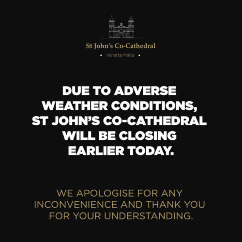 Due to adverse weather conditions, St John’s Co-Cathedral will be closing earlier today.We apologise for any inconvenience and thank you for your understanding. Last admission was at 12:00pm. Stay safe!